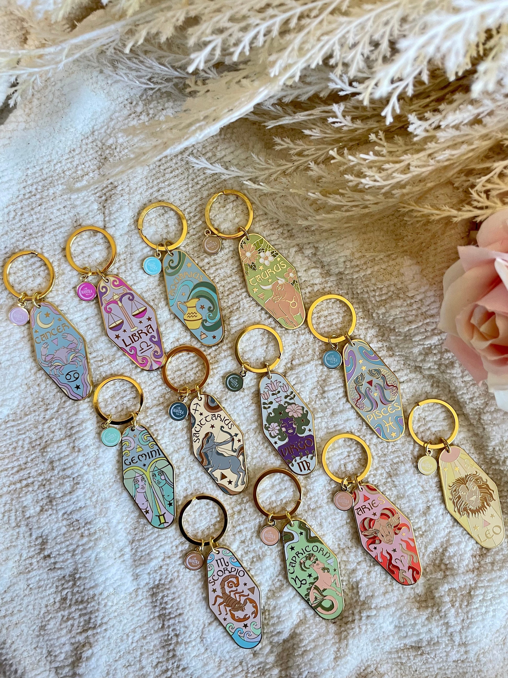 High-quality keychains with one-of-a-kind designs specifically designed for each zodiac. Crafted with hard enamel and gold trims.