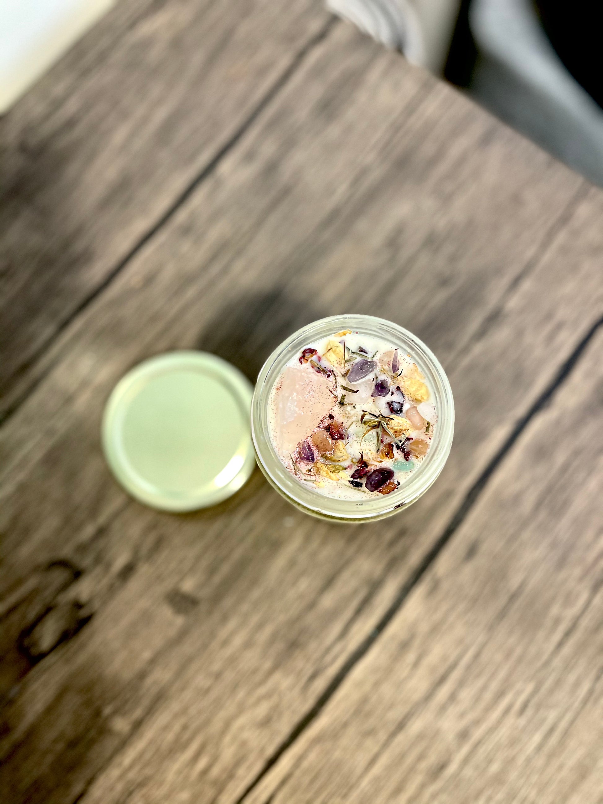 TOP: rose quartz, amazonite, moonstone, amethyst, rose petals, jasmine buds, horsetail herb, black jasmine flowers, biodegradable glitter, love & light